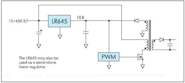 Применение LR645 с фиксированным выходным напряжением позволяет обойтись почти без внешних элементов, а вариант исполнения SO-8 с регулируемым выходом от 8 до 12 В дает возможность работать с ШИМ-контроллерами разных типов. ИС LR745 с автоматическим отключением разработана для ШИМ-контроллеров с высоким напряжением запуска.