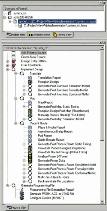 Процесс реализации проекта аппаратной части системы выполняется средствами пакета САПР Foundation ISE. Управление этим процессом может осуществляться как в среде XPS, так и непосредственно в рамках оболочки пакета Foundation ISE — Навигатора проекта (Project Navigator). Требуемый способ управления процессом реализации проекта выбирается при установке параметров проекта EDK с помощью переключателя Implementation Tool Flow [5].