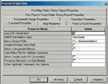Рис. 2. Диалоговая панель параметров для процесса реализации проекта (вкладка Translate Properties)