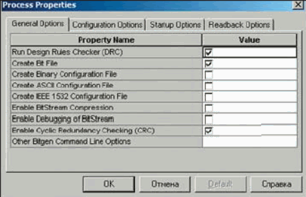 Процесс создания конфигурационной последовательности для ПЛИС семейств FPGA выполняется средствами пакета Foundation ISE в автоматическом режиме. Все необходимые директивы конфигурирования и последующей активизации кристалла задаются с помощью параметров рассматриваемого процесса перед его выполнением. Вызов диалоговой панели, в которой расположены эти опции, осуществляется уже привычными способами.