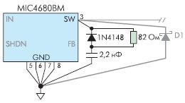 Работа фотовспышек и подобных им стробоскопических излучателей основана на разряде высоковольтного конденсатора на лампу. Чтобы обеспечить работу такого устройства от батареи или другого низковольтного источника, необходим преобразователь, повышающий напряжение приблизительно до 300 В. Пример реализации импульсного преобразователя с высоковольтным выходом на повышающем стабилизаторе MIC3172 приведен на рис. 9.