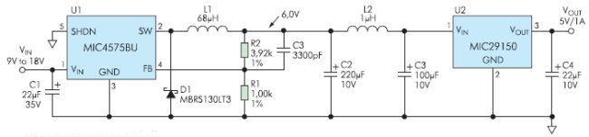 Другим способом кардинально снизить уровень шума в выходном напряжении служит включение между импульсным преобразователем и нагрузкой линейного стабилизатора с малым падением напряжения (LDO, о которых было рассказано в первой части публикации). Почти все LDO Micrel обладают хорошими характеристиками по подавлению шумов. На рис. 5 изображена схема стабилизированного источника питания, позволяющего снизить шум до уровня ниже 1 мВ. Для более мощных источников питания (на выходной ток до десятков ампер) можно рекомендовать новые контроллеры LDO MIC5190/91, выполняющие функцию активного фильтра и способные снизить уровень шумов более чем на порядок. Такая характеристика достигнута за счет превосходных динамических свойств и дополнительного встроенного усилителя ошибки.
