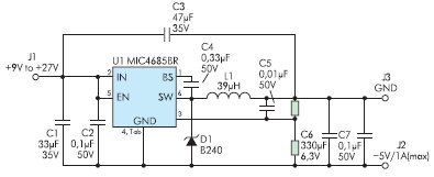 MIC2172/3172 — один из многих преобразователей Micrel, с высокой эффективностью работающих во многих конфигурациях. Пример, приведенный на рис. 11, может быть востребован в приложениях с питанием от батареи из 4 обычных гальванических элементов 1,5 В. По мере их разряда напряжение может снижаться с 6 до 3,6 В, но MIC3172 обеспечит стабильное выходное напряжение 5 В.