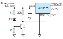 Когда входное напряжение снижается до минимально допустимого, частота и скважность генератора также уменьшаются. Но меньше предельных значений они не могут стать в силу схемотехнического решения на кристалле. Поэтому, если входное напряжение опускается ниже предельного, выходное напряжение становится нестабильным, генератор может остановиться и выходной ключ может оказаться в открытом состоянии, что приведет к короткому замыканию по входу. Многие типы импульсных преобразователей Micrel имеют встроенную схему защиты от низкого входного напряжения (UVLO — Under Voltage LockOut). Но не каждый. Тем не менее реализовать подобную защиту на небольшом количестве внешних компонентов и при наличии входа включения-выключения (функция включения-выключения реализована в каждом преобразователе Micrel) довольно просто. Вариант такой схемы показан на рис. 8. Принцип ее работы заключается в подаче сигнала выключения преобразователя при достижении входным напряжением заданного нижнего предела. Сигнал выключения гарантированно переводит выходной ключ в закрытое состояние, не останавливая встроенный генератор, что позволяет без задержек восстановить выходное напряжение после возвращения рабочих условий эксплуатации.