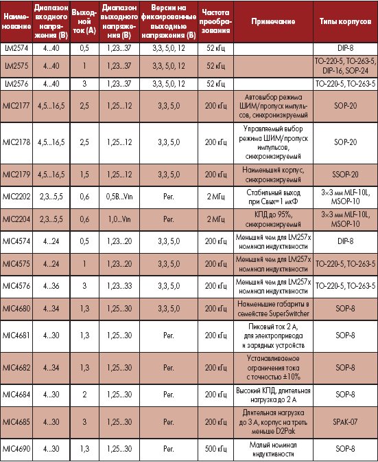 Два семейства понижающих преобразователей LM257x и MIC457x функционально повторяют друг друга и включают по три серии, различающиеся величиной максимального тока через открытый ключ — 0,5, 1,0 и 3,0 А. Семейства ориентированы на построение источников питания от 2 до 15 Вт и различаются частотой преобразования и шириной диапазона входных напряжений. LM257x работает на сравнительно низкой частоте — 52 кГц, но допускает десятикратное изменение входного напряжения — от 4 до 40 В. MIC457x имеет частоту преобразования 200 кГц и, соответственно, требует в 4–10 раз меньшую индуктивность.