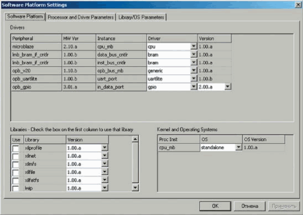 В таблицу Drivers заносится информация о драйверах всех периферийных устройств, которые были включены в состав спецификации аппаратной платформы разрабатываемой системы. Эта таблица содержит пять колонок. В ячейках, расположенных в колонке с названием Peripheral, указываются идентификаторы типа компонентов, которые перечислены в спецификации MHS. В колонке HW Ver содержится информация о версии аппаратных средств для каждого компонента, указанного в предыдущей колонке. В ячейки, относящиеся к столбцу с названием Instance, вносится идентификатор экземпляра компонента, включенного в состав спецификации MHS разрабатываемой микропроцессорной системы.