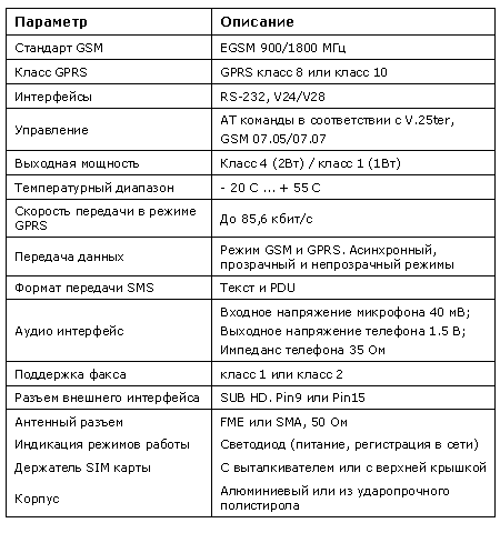 Таблица 1. Общие технические характеристики GSM/GPRS терминалов ведущих мировых производителей