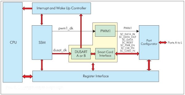 Модуль интерфейса смарт-карт (Smart Card Interface – SCI) содержит полную логику, необходимую для оконечной части (терминала) этого интерфейса. Последовательности действий при запуске и дезактивации реализованы с различной степенью автоматизации. Поддерживается протокол типа Т=0 (части 1-10 стандарта Smart Card ISO 7816). Следует отметить, что хотя все основные последовательности действий по установке карт, их активации и дезактивации реализованы аппаратно, встроенной поддержки переключения уровня напряжения, определения подделки или защиты от короткого замыкания в нагрузке нет (обычно вероятность наиболее высока при вставке и извлечении смарт-карты). Поэтому необходимо, чтобы между микроконтроллером и терминалом смарт-карты была включена внешняя схема интерфейса. Тактирование смарт-карты выполняется через модуль таймера (TIM). Помимо управления внешним источником тактовых сигналов, модуль SCI может использоваться для управления ШИМ-выходом PWM1. Частота тактового генератора SCI программируется с помощью регистра TIМ.