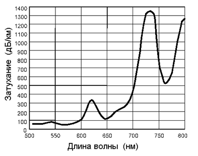 Рис. 1. Спектральная характеристика затухания в пластиковом оптоволоконном кабеле