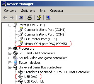Изображенные на рисунках наименования "Virtual COM-port DAQ" и "USB DAQ" были введены в соответствующие поля при генерации дистрибутива драйверов. Таким образом, используя собственные идентификаторы и модифицированный драйвер, можно скрыть от рядового пользователя истинную "начинку" готового устройства.