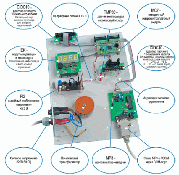Рис. 3. Пример построения макета системы на базе модульной технологии Аверон. В макете системы использован отладочный модуль MC7 на базе PIC18F452. Два порта микроконтроллера подключены к модулю ЕК для обеспечения интерфейса с пользователем. На индикаторе отображается результат измерения температуры окружающей среды. Четыре светодиода имитируют сигналы управления, подаваемые по нажатию кнопок на клавиатуре модуля EK. Программирование и отладка программы микроконтроллера производится программатором MP3