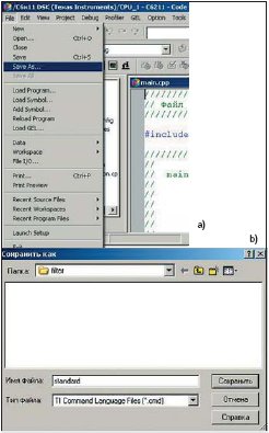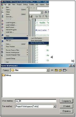 Интерфейс CCS легко можно настраивать под потребности решаемой задачи. Практически все окна и панели инструментов можно «перетаскивать» мышкой. Поэтому, настроив интерфейс, необходимо сохранить эти настройки. Для этого в пункте File главного меню необходимо выбрать раздел Workspase, в нем пункт Save Workspase As и сохранить настройки рабочего пространства в нужной папке с произвольным именем (рис. 21a и 21b).