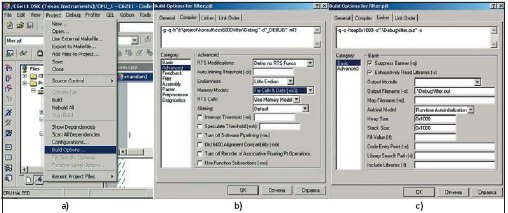 В рамках файловой модели не рекомендуется использовать динамическое распределение памяти. Однако CCS при создании выходного бинарного файла использует динамическую память («хип», или «Heap»), особенно при вызове функций языка С. Поэтому необходимо указать размер памяти, которая выделяется под динамические объекты. Это можно сделать в окне настроек параметров проекта на закладе Linker в категории Basic, где в окне Heap Size указывается размер динамической памяти (рис. 13c). В этой же категории в окне Stack Size необходимо указать размер области памяти, выделяемой под стек (рис. 13c). Размер стека и «хипа» можно определить экспериментально, при тестовых запусках проекта. В рассматриваемом примере используется одинаковый размер этих областей памяти, равный 0`1000.