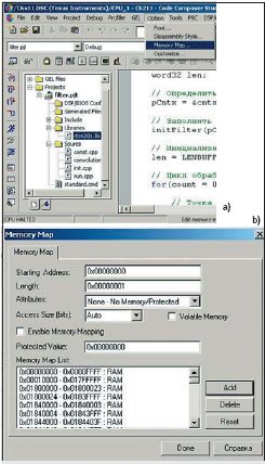 Следующий шаг настройки проекта — определение карты памяти. В главном меню необходимо выбрать раздел Options, далее — пункт Memory Map (рис. 14a). Появится окно настройки карты памяти (рис. 14b). В нем необходимо снять флажок с позиции Enable Memory Mapping. В этом случае CCS будет руководствоваться картой памяти, определенной в файле «standard.cmd».