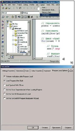 И, наконец, заключительный этап настройки проекта — определение порядка загрузки бинарного файла в ЦСП. В примере используется автоматическая загрузка после каждой трансляции исходных текстовых файлов в исполняемый бинарный модуль (файл с расширением «.out»). Для установки этого режима необходимо выбрать раздел Options главного меню ИСР, далее — пункт Customize (рис. 15a). В появившемся окне выбрать закладку Program Load After Build. На этой закладке установить флажок в позиции Load Program After Build (рис. 15b).