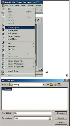 • Компиляция всех файлов проекта (значок на панели быстрых кнопок CCS). При этом все файлы с расширением «.cpp» транслируются в объектные модули (файлы с расширением «.obj»). Затем объектные модули компонуются в выходной файл с расширением «.out». Выходной файл содержит исполняемый бинарный модуль. Исполняемый модуль необходимо загрузить в память процессора. Это происходит автоматически в режиме Load Program After Build. Кроме того, это можно сделать через главное меню CCS: в пункте File выбрать подпункт Load Program (рис. 16a). В появившемся окне указать место расположения (папка Debug проекта), тип (.out) и имя загружаемого файла (рис. 16b).
