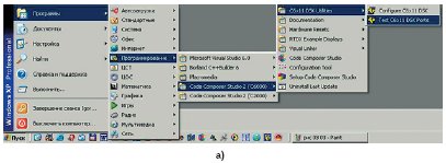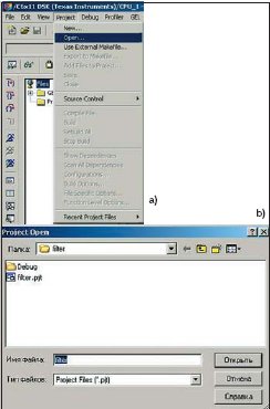 Создание проекта завершено. Однако при повторном запуске CCS и загрузке разработанного проекта через главное меню (в пункте Project необходимо войти в раздел Open и выбрать имя нужного проекта, как это показано на рис. 20a и 20b) ИСР будет запущена при стандартных настройках интерфейса, что часто не очень удобно.