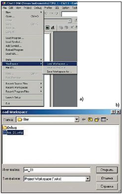 При повторном запуске ИСР производится загрузка не проекта, а рабочего пространства с сохраненными настройками интерфейса CCS (в пункте File войти в раздел Workspase и пункте Load Workspase выбрать нужное рабочее пространство, как это показано на рис. 22a и 22b).