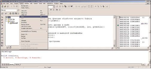 При первоначальной трансляции необходимо использовать первый режим. В дальнейшем, в основном, используется второй и третий режимы. После трансляции проекта и загрузки исполняемого кода в память CCS примет вид, показанный на рис. 17.