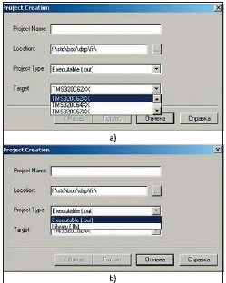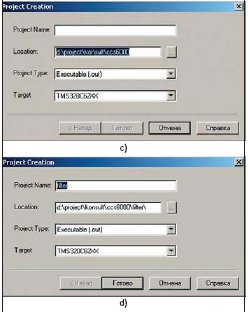Появится диалоговое окно, показанное на рис. 7. В нем задаются семейство ЦСП (рис. 7a), тип проекта (рис. 7b), размещение проекта на жестком диске (рис. 7c) и имя проекта (рис. 7d). Возможны два типа проектов — проект создания исполняемого файла (out) или проект создания библиотеки (lib).