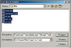 В папку проекта необходимо скопировать файлы с исходным кодом рассмотренного в прошлой статье фильтра. Скопированные файлы подключаются к проекту. Для этого в главном меню CCS выбирают раздел Project, а в нем — пункт Add Files to Project. Появится диалоговое окно Add Files to Project (рис. 8), где указываются тип (файлы с расширением .cpp) и выбираются имена подключаемых файлов.