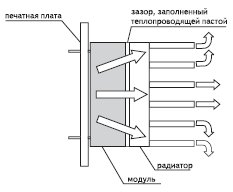 где a = 0,001 – 0,003 Вт/см2°С — коэффициент теплоотдачи, tкmax = 125 °С — температура корпуса, tокр — температура окружающей среды, tкр — разность температур из-за наличия зазора между радиатором и модулем. При заполнении зазора теплопроводящей пастой