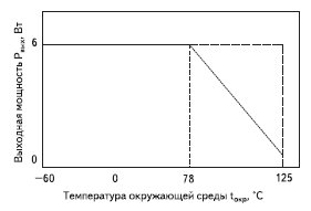 В качестве примера приведем расчет выходной мощности от температуры для модуля МДМ-ВТ мощностью 5 Вт на напряжение 5 В, площадь поверхности которого для охлаждения равна 22 см2. Для расчетов примем a = 0,0013: такой коэффициент теплоотдачи давно применяется разработчиками и соответствует значению 25 см2/Вт при разности температур корпуса модуля и окружающей среды равной 30 °С [3].