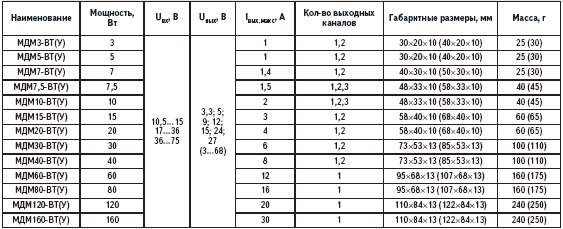 Высокотемпературные модули электропитания серии МДМ-ВТ [2] созданы на основе ранее разработанной серии МДМ с использованием типового ряда линейки корпусов и аналогичного размещения выводов, что немаловажно для потребителей, уже использующих модули серии МДМ. По сравнению с предыдущей серией мощность модулей в тех же габаритах возросла примерно в 1,2–1,4 раза. Мощностной ряд представлен модулями от 6 до 160 Вт (таблица 1).