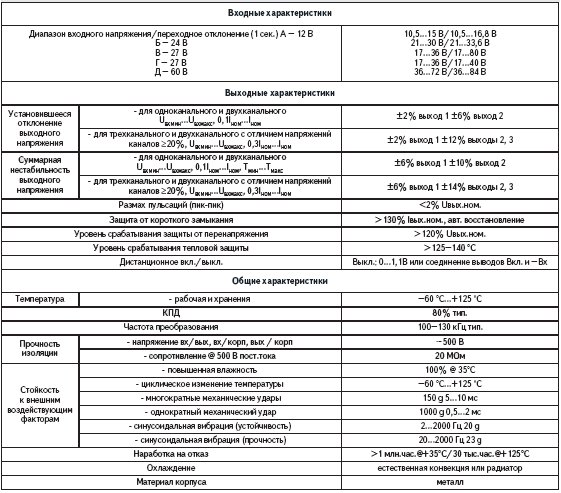 Как и модули серии МДМ, новые приборы имеют фильтры радиочастотных помех на входе и выходе, гальваническую развязку 500 В между входом, выходом и корпусом, а также полный комплекс защиты — от перегрузки, короткого замыкания, перегрева, превышения выходного напряжения (все механизмы защиты предусматривают автоматическое восстановление после снятия воздействия). Удобно также, что модули снабжены функцией дистанционного включения-выключения. Технические характеристики высокотемпературных модулей питания МДМ-ВТ приведены в таблице 2.