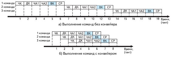 В рассматриваемом примере можно выполнить все операции в одном блоке (параллельно): две операции чтения данных из памяти (пути коммутации не пересекаются), операция условного перехода, операция декрементации переменной цикла, одно умножение и одно суммирование (модули не пересекаются, используется только один кросс-путь).