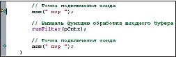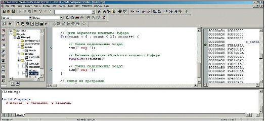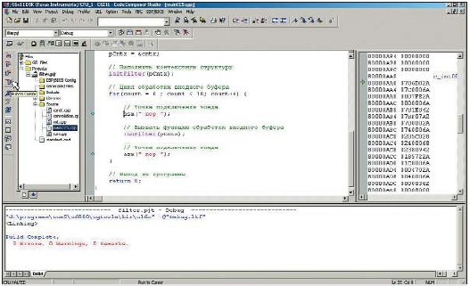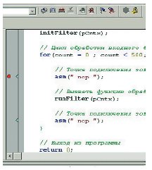 Код функции достаточно прост. В пояснении нуждается только оператор asm(«nop»), который является расширением языка C в CCS. Он служит для гарантированного наличия пустых операторов (nop) до и после вызова функции обработки входного буфера runFilter(). В данном случае пустые операторы — удобное место для подключения контрольных точек.