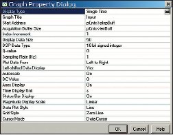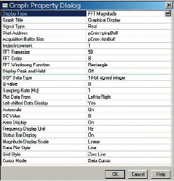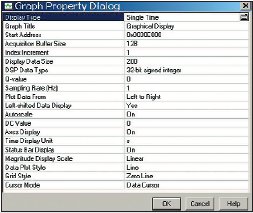 В результате появится окно, где требуется ввести параметры отображения данных (рис. 8). В графе Graph Title можно указать наименование отображаемой области. В графе Start Address указывается начальный адрес отображаемых данных. В примере указан адрес входного буфера через контекстную структуру — pCntx --> pInpBuff. В графе Acquisition Buffer Size — указывается размер отображаемого буфера (в примере это pCntx --> lenBuff). Необходимо также указать количество отображаемых отсчетов (не превышающих размера буфера) в графе Display Data Size. Для примера выбрано значение 50. Все остальные параметры отображения можно оставить без изменений.