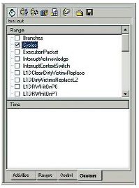 Перейти на вкладку Ranges (рис. 23) и перетащить мышкой функции, для которых будет производиться профилирование, из папки Disabled в папку Enabled (рис. 22). В примере профилирование производится для функций runFilter() и convolution(). На вкладке Custom выбрать размерность профилирования. В рассматриваемом примере профилирование будет производиться в тактах процессора. Для этого ставится галочка напротив позиции Cycles (рис. 24).