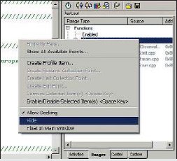 На этом краткий обзор профилирования закончен. В дальнейшем изложении оно не понадобится, поэтому его необходимо выключить. Это производится следующим образом. Выключить режим профилирования, нажав кнопку в окне настройки режима профилирования и закрыть это окно, кликнув правой кнопкой мыши в области окна и выбрав в контекстном меню опцию Hide (рис. 30).