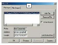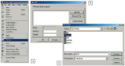 В главном меню CCS выбирают пункт File, в нем подпункт File I/O (рис. 4а). Появится окно File I/O (рис. 4б), где нужно перейти на закладку File Input и нажать кнопку Add File. В диалоговом окне File Input (рис. 4в) выбрать имя входного файла и подтвердить ввод.