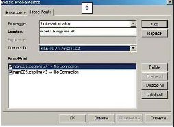 Для тестирования программы необходимо подключить входной и выходной файлы. При этом используются возможности RTDX CCS. В отличие от условий, описанных в предыдущих статьях, оба файла должны существовать. Файлы подключаются при помощи точек зондирования, которые необходимо вначале определить. Для этого необходимо установить курсор на строку кода, содержащую оператор asm(«nop»), и нажать клавишу на панели быстрых кнопок. Действие повторить для второго оператора asm(«nop»).