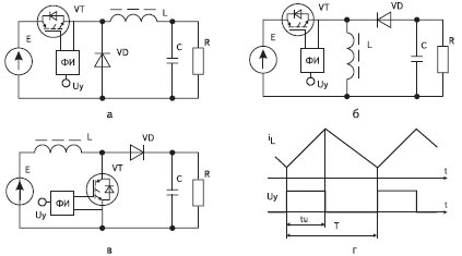 Рис. 1. Преобразователи постоянного напряжения (a — понижающий, б — инвертирующий, в — повышающий, г — зависимость тока индуктивности от управляющего напряжения)