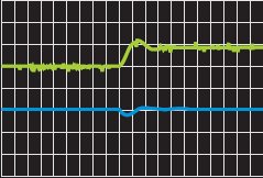 Рис. 5. Верхний луч — ток дросселя, 1 А/дел, ноль в начале координат; нижний луч — напряжение на нагрузке, 5 В/дел., ноль в –3 деления. Временная ось — 2,5 мс/дел