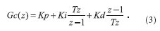 где Kp, Ki, Kd — коэффициенты пропорциональной, интегральной и дифференциальной частей соответственно. Цифровая реализация этого регулятора получается путем замены операций дифференцирования и интегрирования разностными уравнениями. Проведя необходимые математические преобразования, получаем передаточную функцию цифрового ПИД-регулятора в следующем виде:
