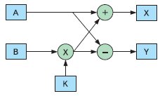 А теперь давайте представим, что задача, выполняемая вычислителем, не столь велика и разнообразна, и поэтому мы можем собрать, скажем так, «несколько аппаратных вычислительных узлов в один». Примером такой задачи может служить вычисление «бабочки» при FFT. Вот алгоритм расчета «бабочки» (рис. 11). Здесь А и В — входные данные, X и Y — выходные данные. Блок, обозначенный как «+», выполняет операцию суммирования, блок со знаком «–» выполняет операцию вычитания, а блок со знаком «х» — операцию перемножения над данными, поступающими от В и К.